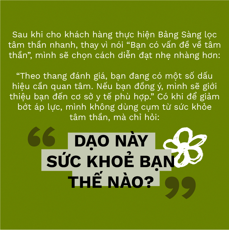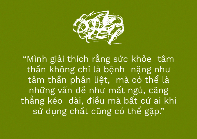 “Có những khách hàng “cứng đầu” hơn một xíu, mình sẽ chuyển sang các chủ đề hoặc can thiệp khác như dự phòng HIV hay Ăn – Uống – Ngủ lặp lại, từ đó dần khơi gợi sự quan tâm của họ. Đôi khi, một số gợi ý thực hành như thiền, hít thở sâu cũng đủ giúp giảm lo âu, hồi hộp”.