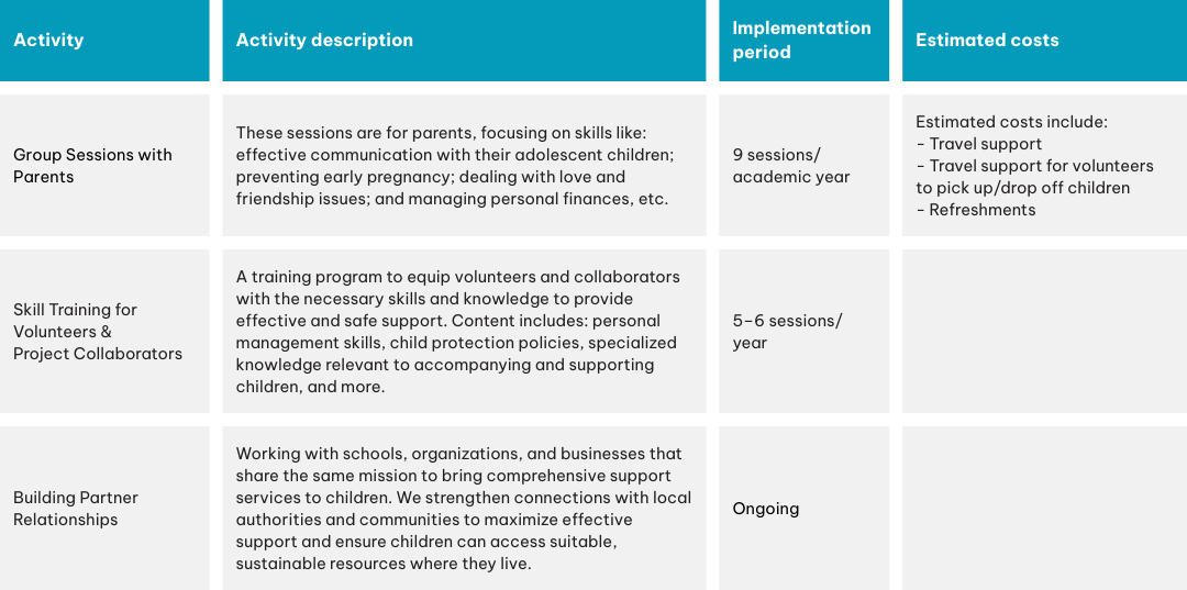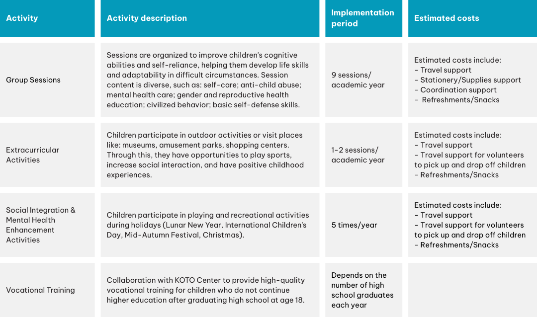 - Standard intervention package (5,780,000 VND/child/year, 2025): Includes tuition, health insurance, personal insurance, books, and school supplies, facilitating partner integration into existing programs.