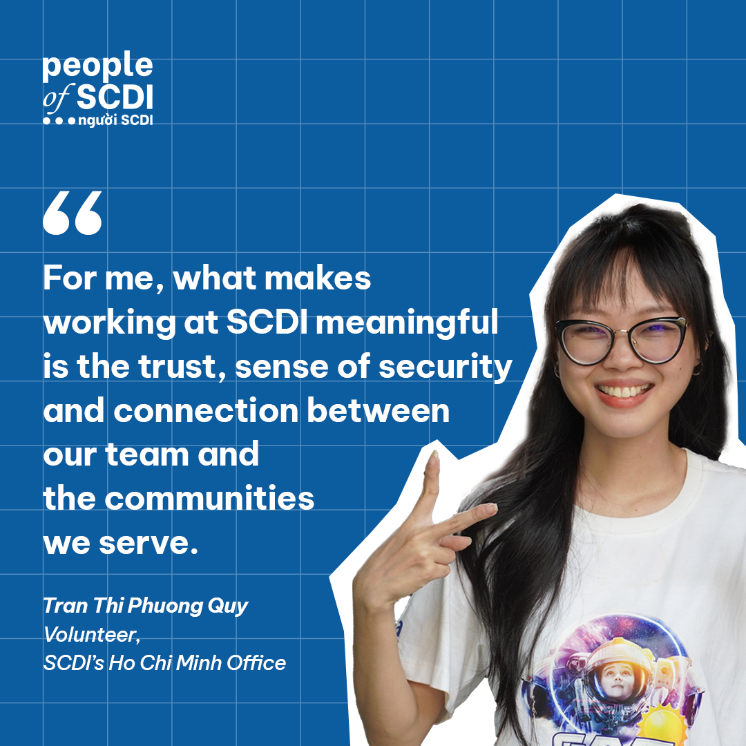 Working at SCDI has not only given me valuable professional experience, but also broadened my perspective, making me more understanding, more grounded. What keeps me here is the joy I find in this work and the inspiring colleagues like Ms. Thúy and Mr. Phúc, who lead not just through words but by example. To me, SCDI is more than a workplace; it’s where I’ve grown alongside the community.