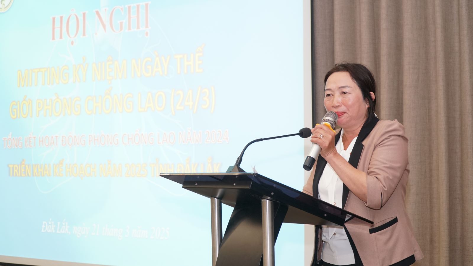 CSET Dương Thị Thảo chia sẻ quá trình hỗ trợ bệnh nhân lao tuân thủ điều trị tại lễ mít tinh hưởng ứng Ngày Thế giới phòng chống lao (24/03) năm 2025. (Ảnh: Quang Nhật)