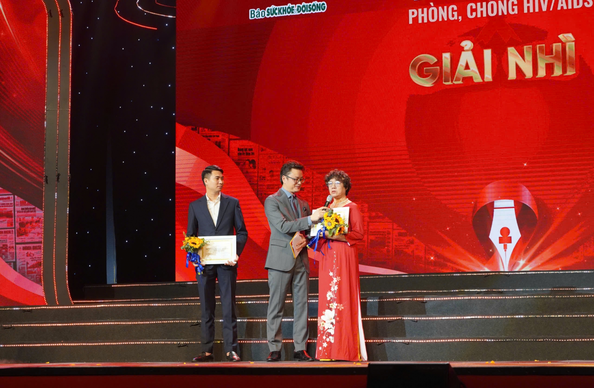 Ảnh: Chị Phạm Thị Huệ và nhóm tác giả bài viết "Anh hùng châu Á Phạm Thị Huệ: Người phá vỡ 'bức tường' kỳ thị và hành trình SỐNG ĐẸP” (Báo Sức khỏe & Đời Sống) nhận Giải Ruy Băng Đỏ