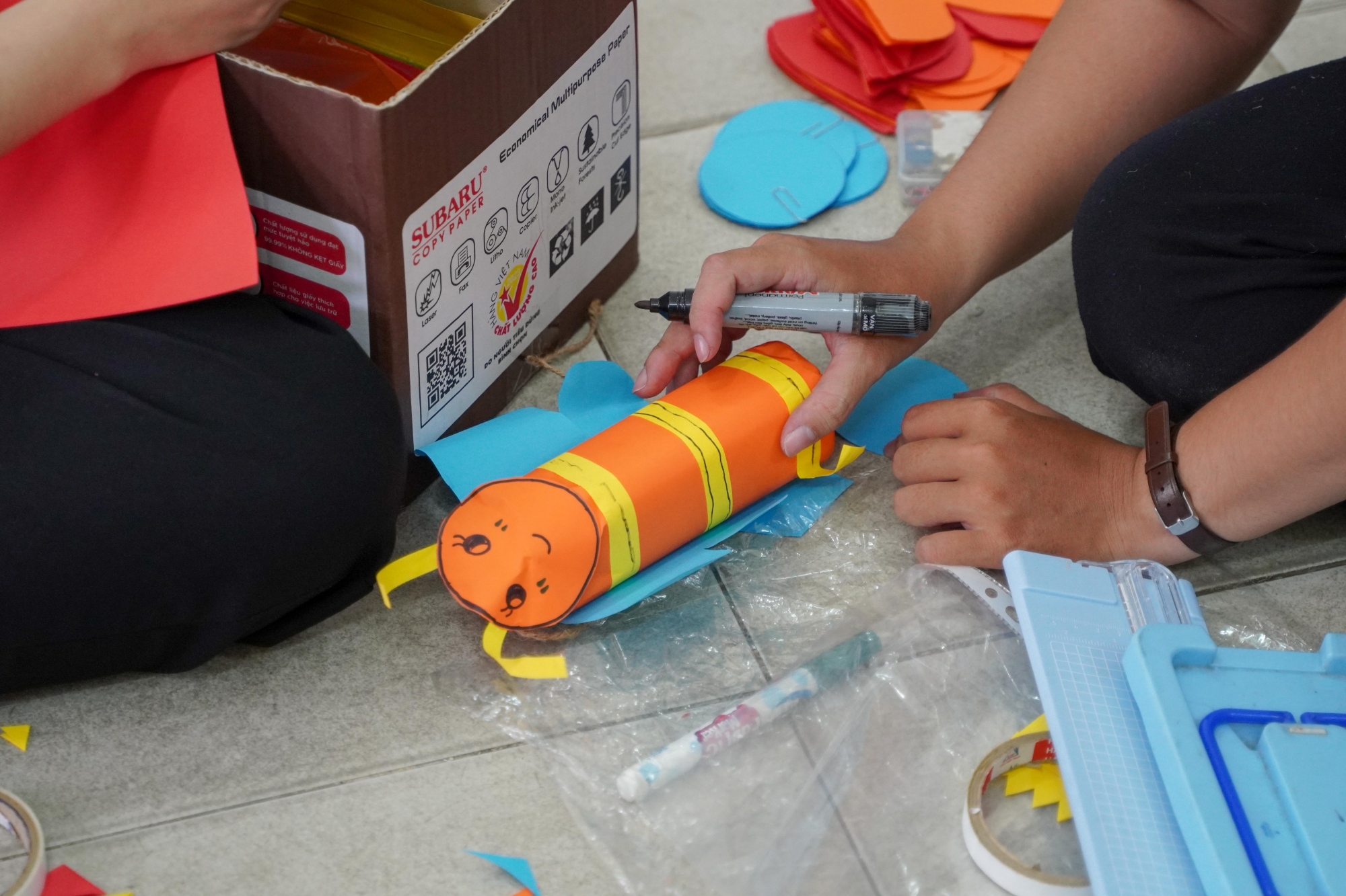 Song song với đó, các tình nguyện viên và thành viên SCDI cùng thu gom, làm sạch chai nhựa để các em sử dụng trong hoạt động làm lồng đèn tái chế. Hoạt động vừa giúp trẻ phát huy khả năng sáng tạo, vừa lan tỏa thông điệp về ý thức bảo vệ môi trường.