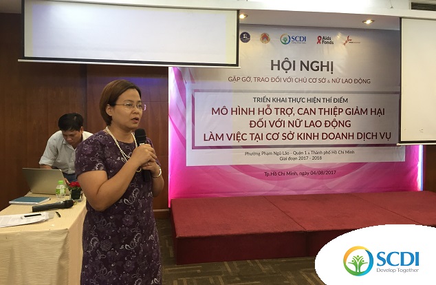 Ngày 5/8/2017, Hội nghị gặp gỡ trao đổi với chủ cơ sở và nữ lao động đã được tổ chức tại phố Phạm Ngũ Lão, Quận 1, Tp. Hồ Chí Minh; giữa SCDI và đại biểu Chi cục Phòng chống tệ nạn xã hội, Sở LĐTBXH, UBND phường Phạm Ngũ Lão, cùng sự tham gia của đại diện 14 cơ sở kinh doanh dịch vụ, nhằm chia sẻ ý kiến về những thuận lợi, khó khăn, đề xuất các hoạt động trong mô hình để hỗ trợ cho nữ lao động. Kết luận Hội nghị, ông Lê Văn Quý - Phó chi cục Phòng chống tệ nạn xã hội Tp. Hồ Chí Minh đã gửi lời cảm ơn đến các chủ cơ sở dịch vụ và nữ lao động về những đóng góp và đề xuất, mong các chị em nữ lao động đến với Câu lạc bộ để được nhận hỗ trợ. Các lãnh đạo phường, chi cục cũng sẽ luôn chung tay hỗ trợ Câu lạc bộ để mô hình trở nên thật sự hiệu quả.