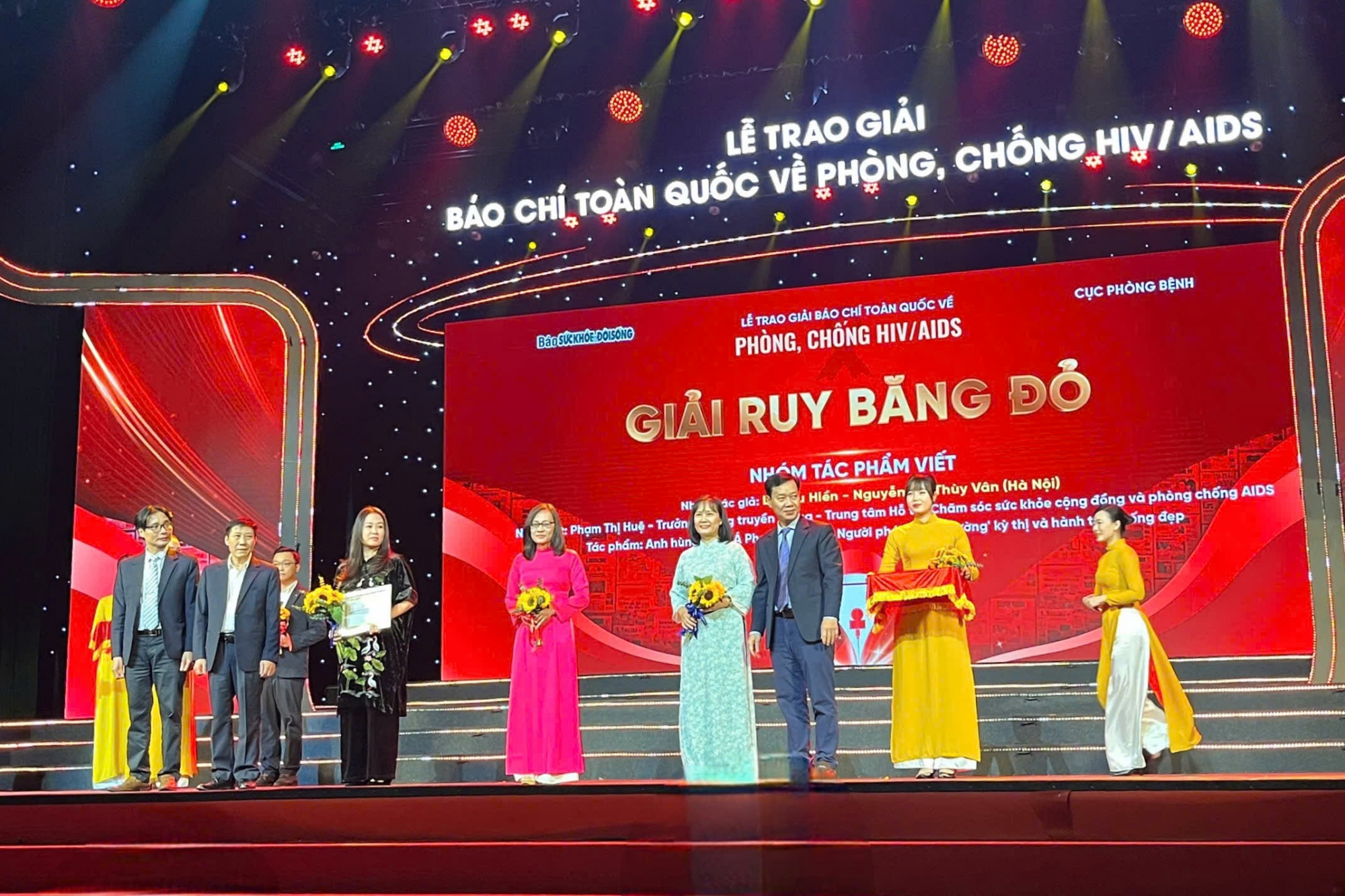 Ảnh: Chị Phạm Thị Huệ và nhóm tác giả bài viết "Anh hùng châu Á Phạm Thị Huệ: Người phá vỡ 'bức tường' kỳ thị và hành trình SỐNG ĐẸP” (Báo Sức khỏe & Đời Sống) nhận Giải Ruy Băng Đỏ