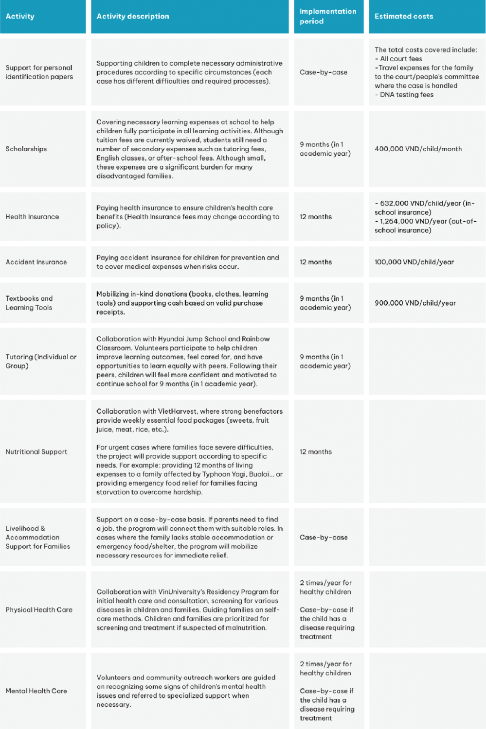 - Standard intervention package (5,780,000 VND/child/year, 2025): Includes tuition, health insurance, personal insurance, books, and school supplies, facilitating partner integration into existing programs.