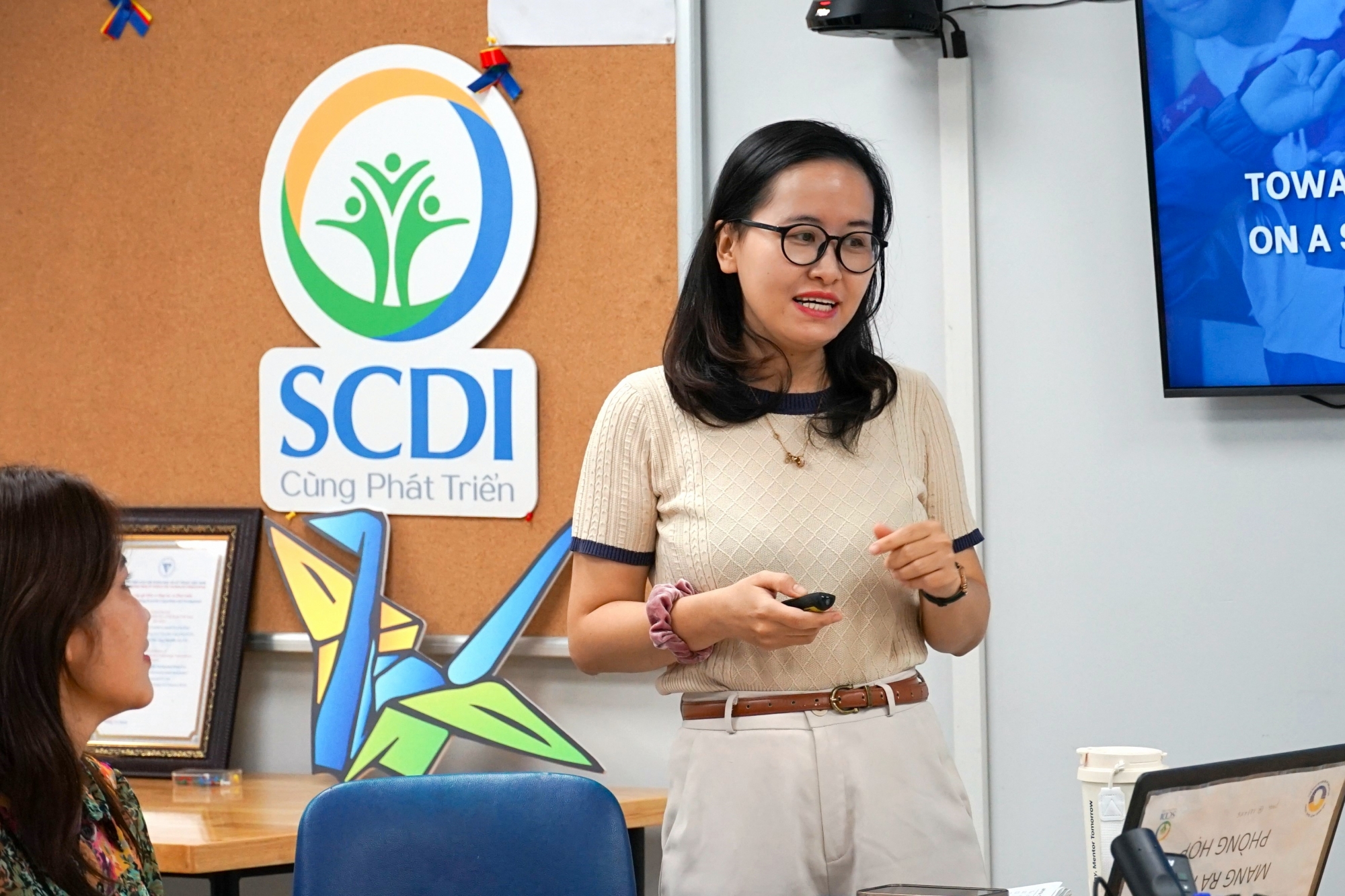 Photo: Ms. Nguyen Minh Trang, Manager for Children & Youth and Harm Reduction & Addiction Treatment programs, introducing SCDI during the exchange session.