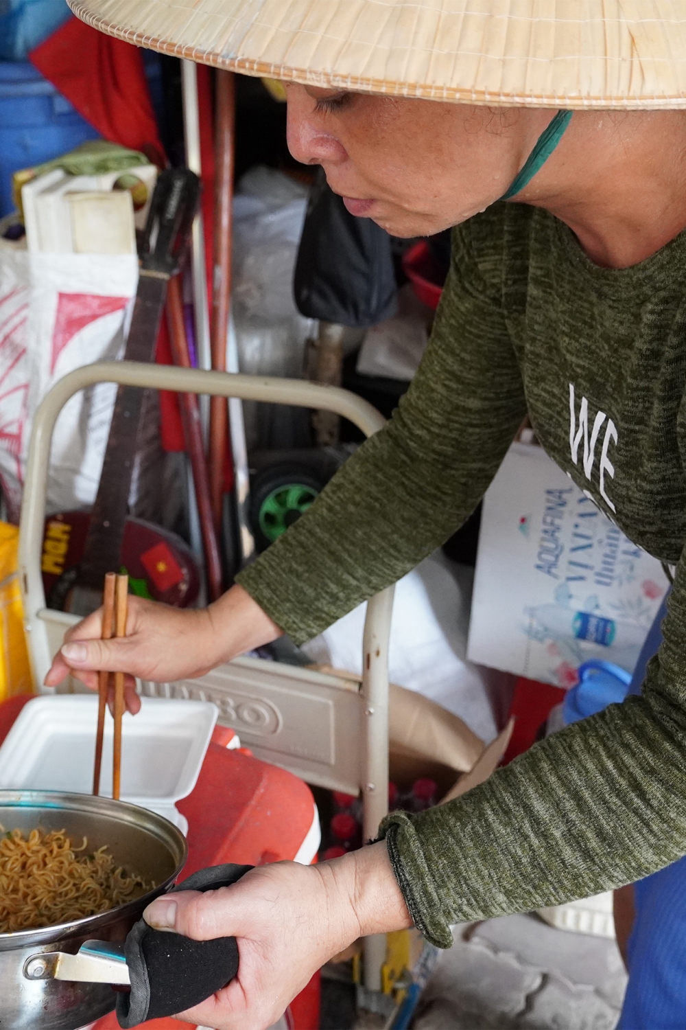"Sweetheart, sit down, I'll finish it soon..." Linh insists as I wade through the mess to watch her make noodles. The cart was her lifeline in the days after she quit her singing career to be a carer for her parents. Once upon a time, she had to push the cart around to find customers, nowadays people come to her. Lin’s takeaway is known because of her delicate preparation, delicious taste, and affordable prices.
