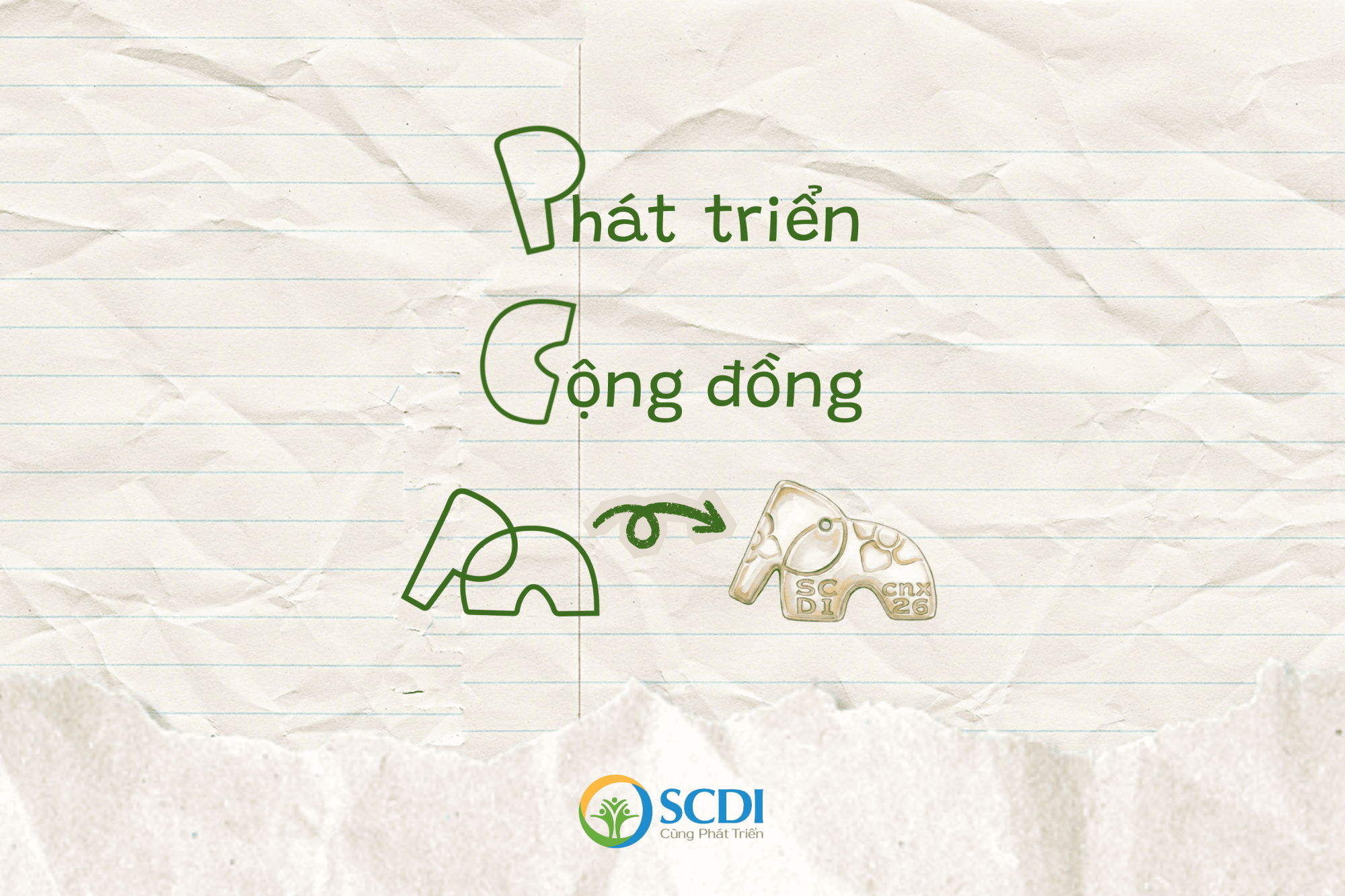 Hình dáng của charm voi được thiết kế từ sự kết hợp khéo léo giữa hai chữ cái P và C - lấy cảm hứng từ cụm từ “Phát triển Cộng đồng” trong chính tên gọi của SCDI.