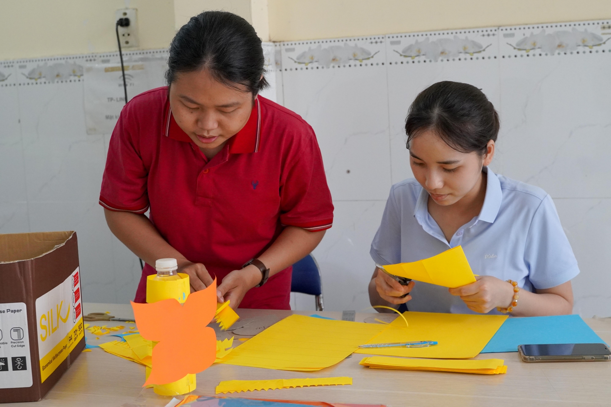 Song song với đó, các tình nguyện viên và thành viên SCDI cùng thu gom, làm sạch chai nhựa để các em sử dụng trong hoạt động làm lồng đèn tái chế. Hoạt động vừa giúp trẻ phát huy khả năng sáng tạo, vừa lan tỏa thông điệp về ý thức bảo vệ môi trường.