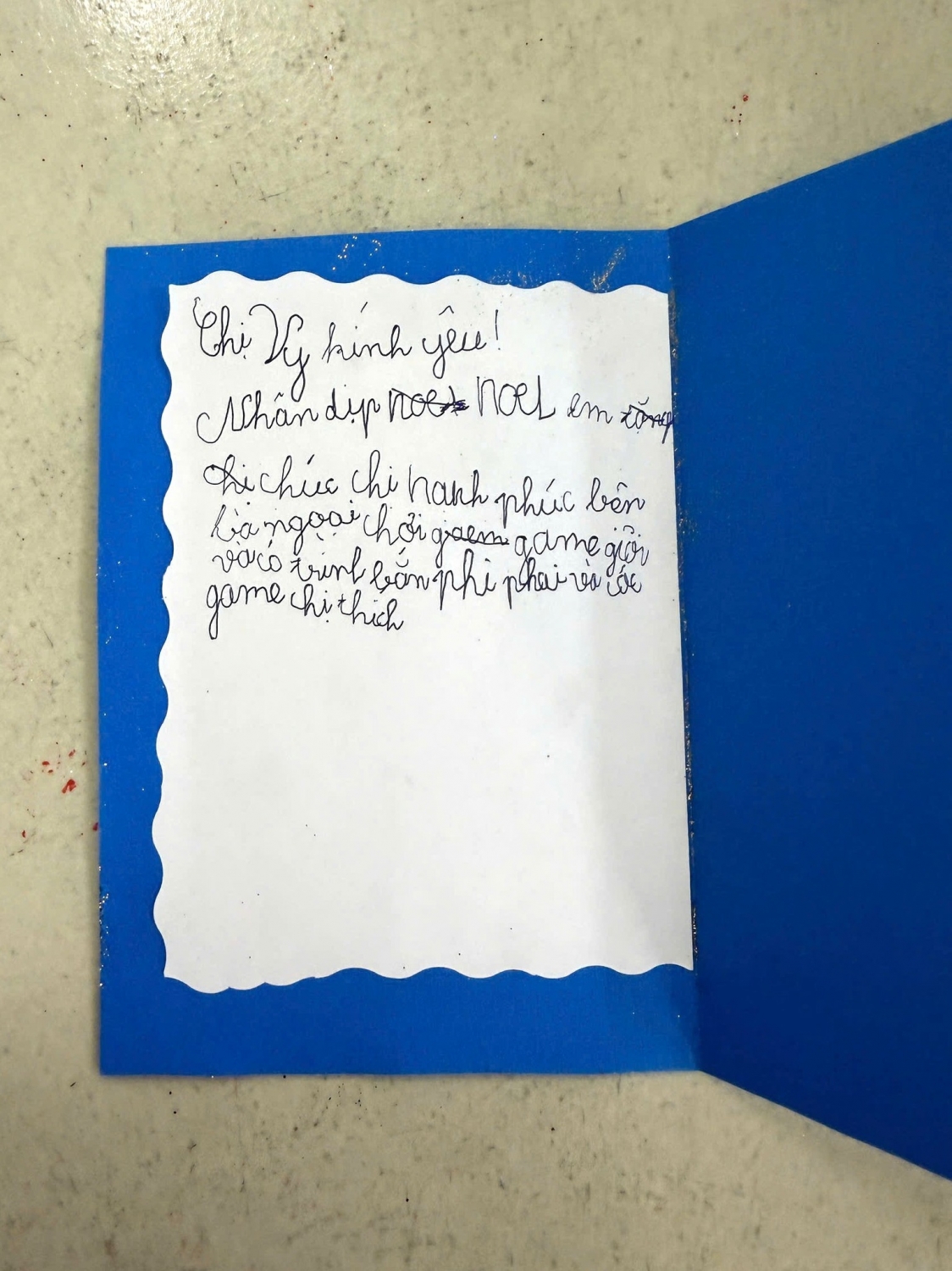 Tại buổi sinh hoạt, các em được hướng dẫn tô màu, trang trí thiệp và ghi những lời chúc gửi đến những người thân yêu. Hoạt động không chỉ mang đến niềm vui trong dịp Giáng sinh, mà còn tạo không gian để các em được thể hiện sự sáng tạo, sự tập trung và cảm nhận sự kết nối trong một môi trường an toàn, thân thiện.