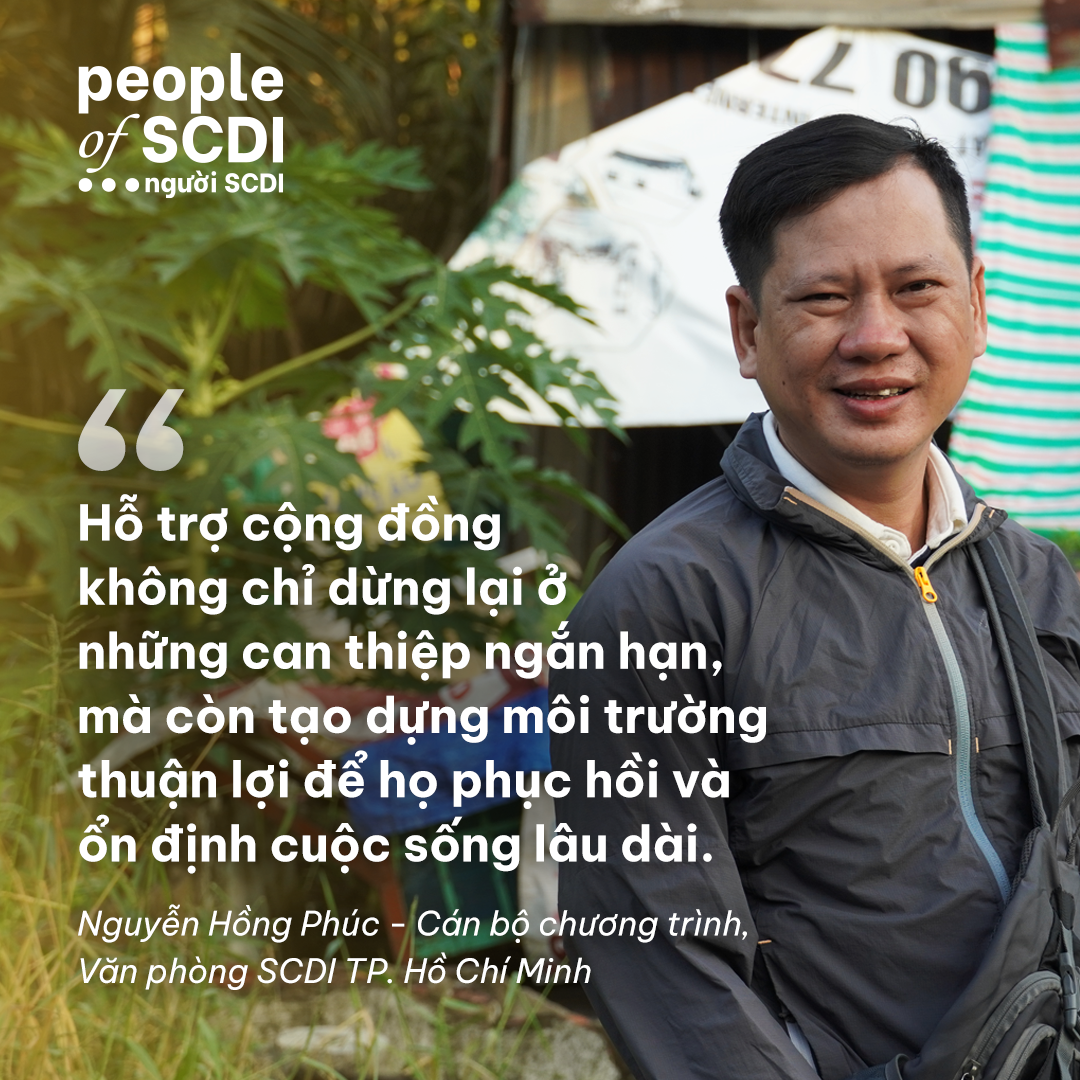 "Khi làm việc tại SCDI và trực tiếp tham gia các hoạt động hỗ trợ cộng đồng, nền tảng kiến thức về công tác xã hội đã trở thành lợi thế lớn đối với tôi. Nhờ nền tảng ấy, tôi có khả năng thu thập thông tin hiệu quả từ khách hàng để thấu hiểu những khó khăn mà họ đang phải đối mặt, từ đó xây dựng những phương án hỗ trợ phù hợp nhất.