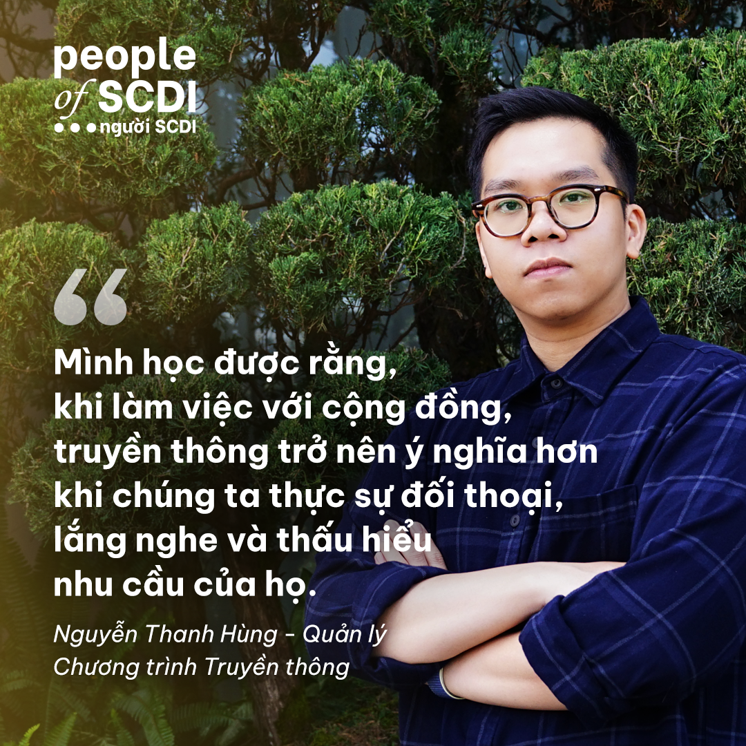 "Trong quá trình làm truyền thông tại SCDI, mình có cơ hội gặp gỡ và trò chuyện với nhiều cộng đồng dễ bị tổn thương và bị lề hóa. Với nền tảng kiến thức và kỹ năng từ ngành công tác xã hội, mình có thể lắng nghe họ với sự thấu cảm và không phán xét, tạo không gian an toàn để họ chia sẻ những khó khăn đang phải đối mặt. Trong cùng thời điểm thu thập thông tin truyền thông, mình có thể nhận diện những vấn đề của khách hàng dự án đang gặp phải, từ đó phản hồi kịp thời tới các chương trình kỹ thuật để xây dựng phương án hỗ trợ hiệu quả nhất.
