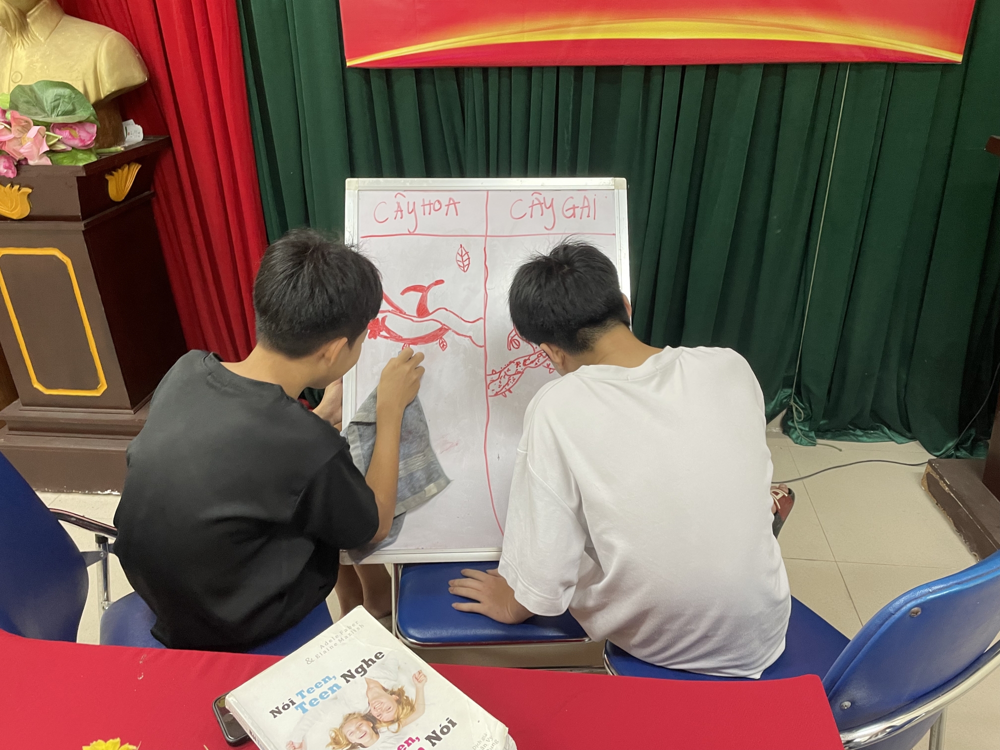 Với chủ đề “Mối quan hệ bạn bè tích cực”, các em tham gia hoạt động “Vườn hoa bạn tốt - Gai nhọn bạn xấu” nhằm nhận diện những đặc điểm của một tình bạn dựa trên sự tôn trọng và hỗ trợ lẫn nhau. Thông qua trao đổi và xử lý tình huống, trẻ có cơ hội nhìn lại trải nghiệm của mình, phân biệt giữa những ảnh hưởng tích cực và những tác động có thể gây tổn thương.