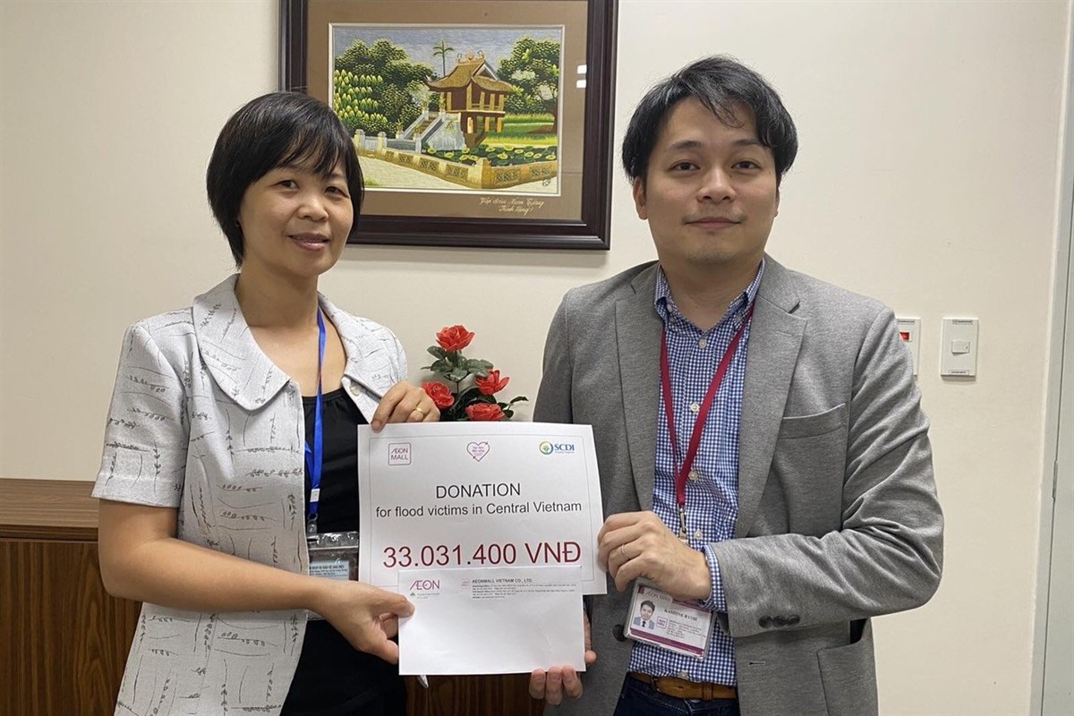 Từ khi bắt đầu xẩy ra lũ bão ở miền Trung, SCDI đã phối hợp với Mỗi ngày Một quả trứng và đối tác ở địa phương, với một phần đóng góp từ khách hàng của AEON MALL, cung cấp thực phẩm, vật dụng thiết yếu cho bà con. Khoản tài trợ nhận được hôm nay sẽ được sử dụng để hỗ trợ bà con phục hồi sinh kế và cuộc sống sau lũ, cũng như tăng khả năng ứng phó của người dân trong những đợt bão lũ sau.